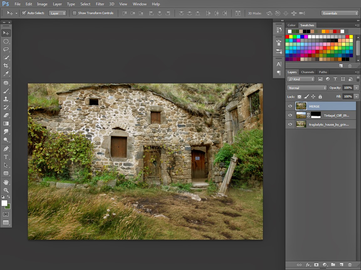 2. Stok yang Kedua adalah Rumah Rumput, di bawah layer stok yang pertama, lalu gunakan masking pada layer rerumputan untuk menghapus bagian laut dan langit….
