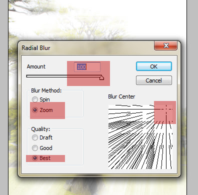 5. Beri efek Blur, Filter > Blur > Radial Blur, aturlah Amount : >100, Blur Method : Zoom, Quality : Best