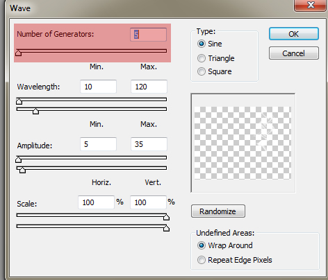 3. Tambahkan efek Wave, Filter-Distort-Wave, naikan menjadi 5
