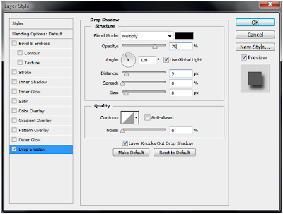 4. Double klik pada “Layer 2” lalu pilih “Drop Shadow” silahkan atur nilai “Angel,Opacity,Distance,Spread dan size” tapi di tutorial saya menggunaka nilai opsinya seperti gambar dibawah ini :