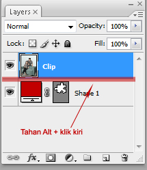 5. Jika Layer clip sudah di atas tekan Alt+klik kiri mouse tepat di batas garis Layer clip dan layer shape 1