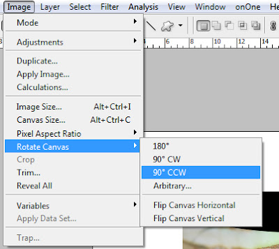 6. Setelah photo berubah, ubah lah posisi semua layer, Image > Rotate Canvas > 90* CCW
