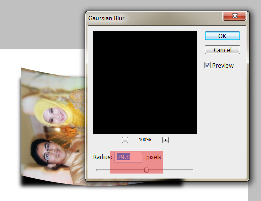 8. Buka efek Blur, Filter-Blur-Gaussian Blur, untuk Radius sesuikan saja, lanjut dengan menurunkan Opacity pada layer 1 (warna hitam), turunkan menjadi 75 % atau 50 %.
