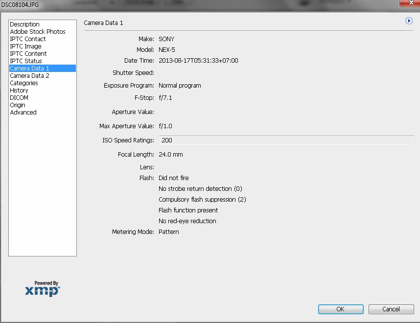 2. Dalam Tab tersebut terdapat Info Photo, anda pilih menu Camera Data 1, maka akan muncul tipe kamera, model data waktu samapi dengan ISO pun akan di tampilkan infonya.