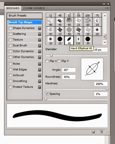 Buka menu Windows-brush, Pada Brush Tip Shape pilihlah bentuh Hard Elliptical 45 dan atur besar kecilnya brush