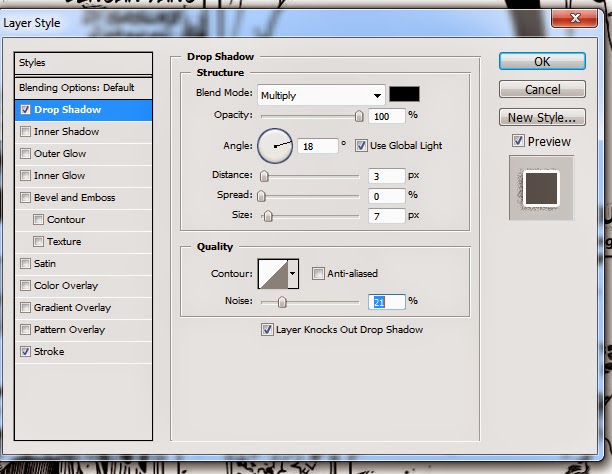 Tambahkan juga Drop Shadow dengan angle 18 , noise diatas 20% dan size 7px