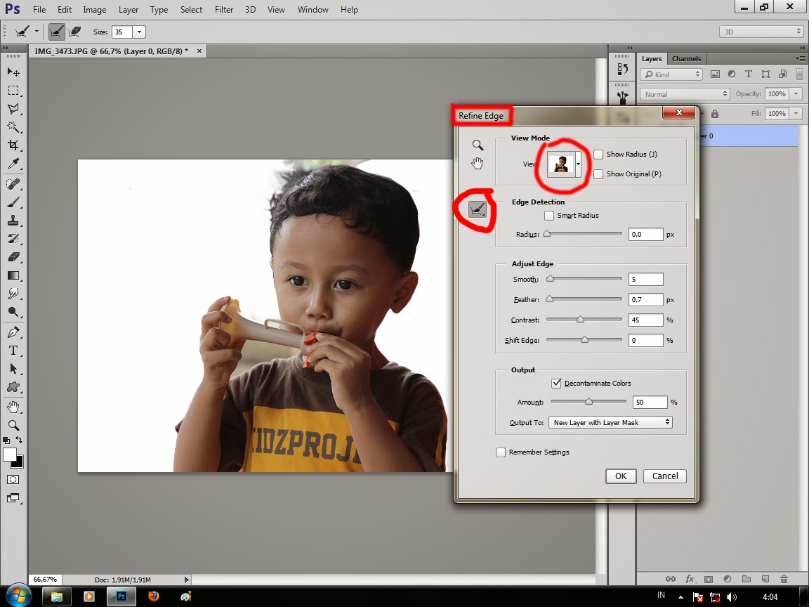- Seperti terlihat pada gambar atur nilai dari Smooth, Feather, Contrast, Shift Edge dan Amount sesuai keinginan, lalu ubah tombol pada view mode menjadi On White lalu gosok menggunakan brush setiap tepi pada objek untuk merapihkan hasil potongan, apabila sudah merasa cukup klik ok.