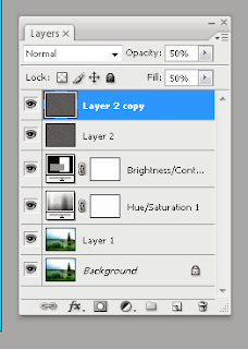 Duplikat Layer 2, Jadikan 50% Opacity dan Fillnya (Layer 2 dan Layer Copy 2)