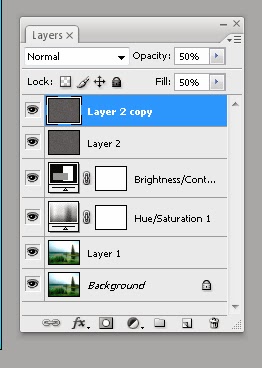 Duplikat Layer 2, Jadikan 50% Opacity dan Fillnya (Layer 2 dan Layer Copy 2)