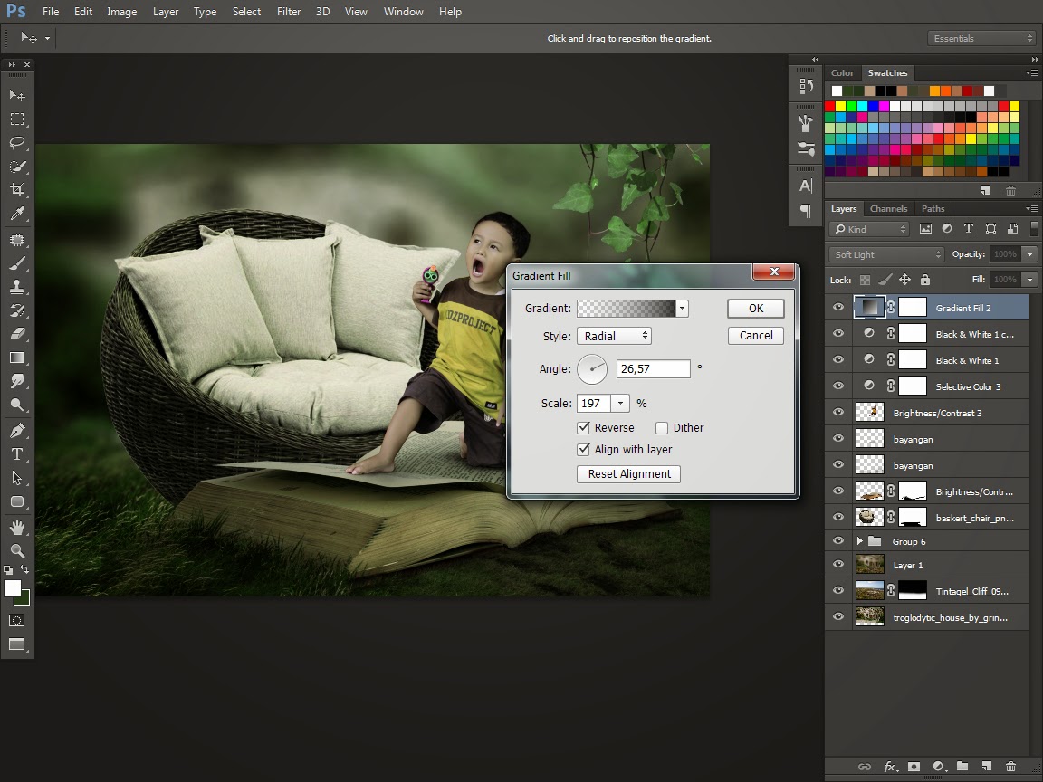 13. Gunakan Gradient Fill Hitam dengan blending mode softlight seperti terlihat pada gambar, lalu atur nilainya sesuai keinginan, dan atur juga posisi yang akan kita buat gelap dengan mouse.