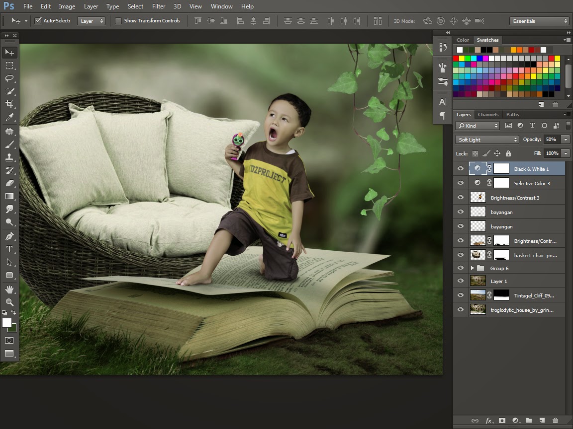 11. Lalu gunakan Black & White dengan blending mode Softlight opacity 50%