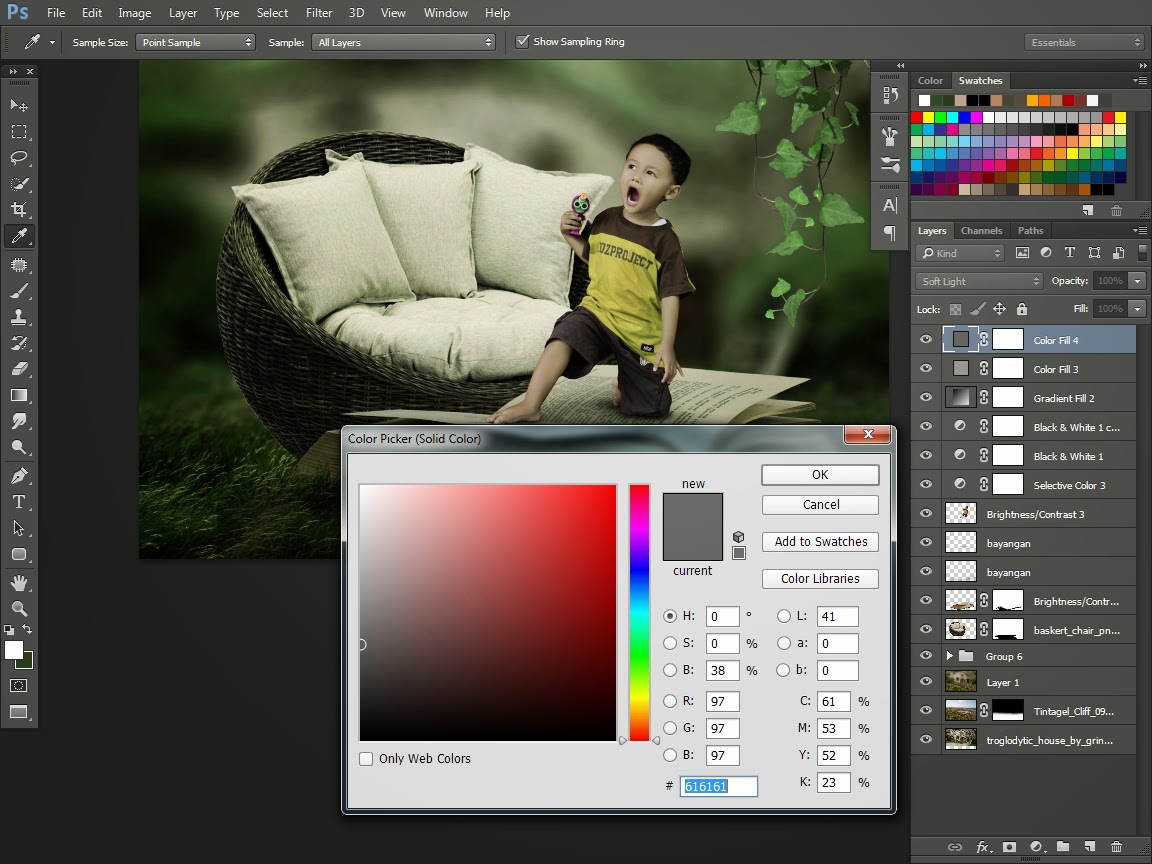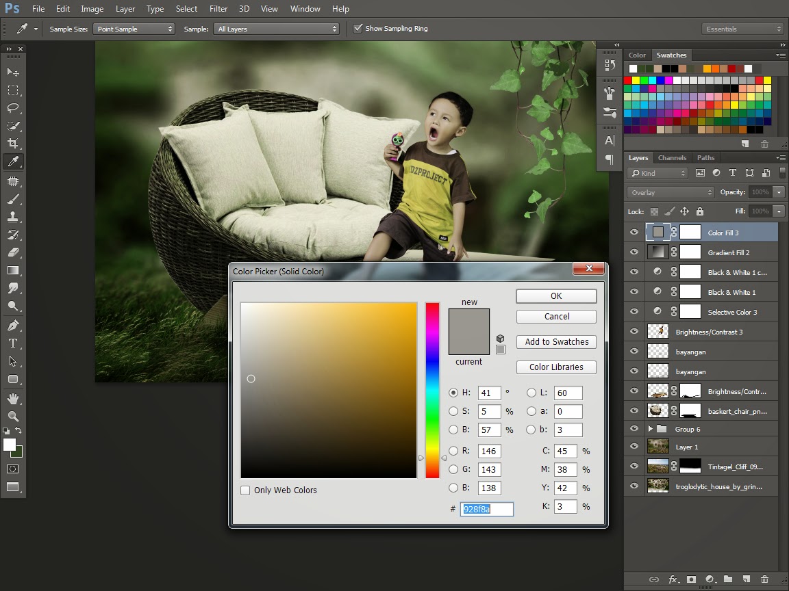 15. Selanjutnya masih menggunakan color fill disini saya menggunakan warna abu tua tetapi tidak terlalu gelap dengan blending mode softlight , color fill disini gunanya untuk membuat lebih terang dan lebih gelap atau membuat warna dominan pada gambar keseluruhan.