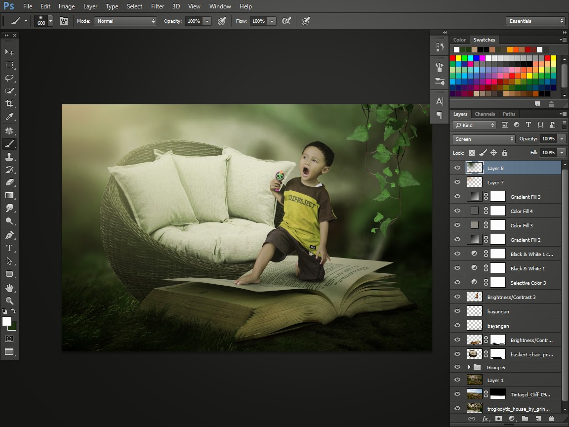 9. Stok inti disini saya menggunakan foto anak kecil, seperti terlihat pada gambar ada layer bayangan di bawah layer anak kecil, buat bayangan menggunakan brush warna hitam dengan opacity 5 s/d 10 px. Patokannya mengacu pada arah cahaya, dan jatuhnya bayangan.