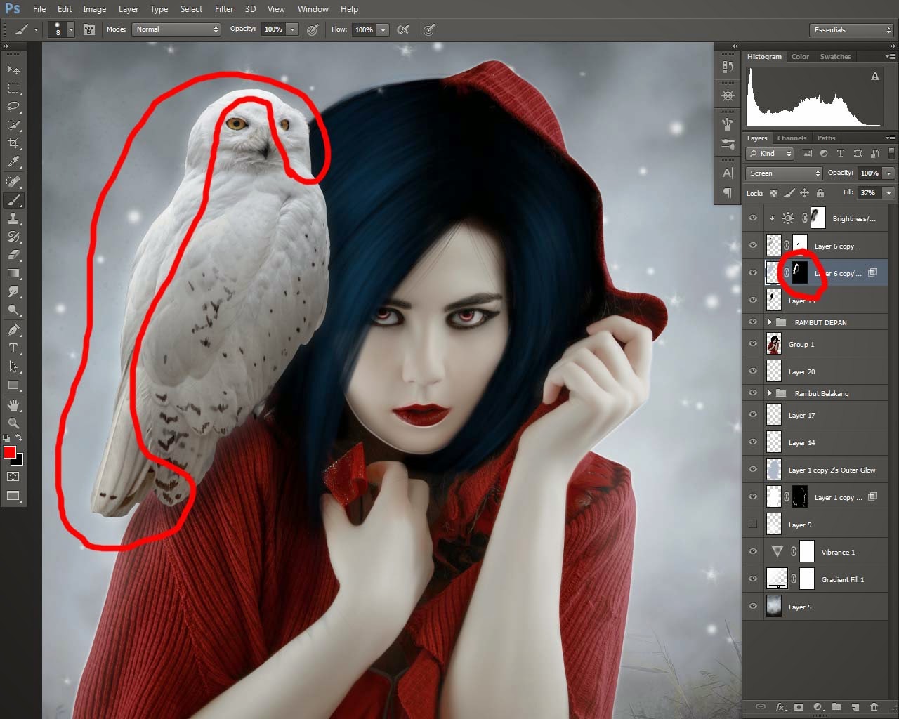 31. Untuk mempercantik saya gunakan burung hantu putih anda bisa mendownload di wewedeviantart(dot)com dengan keyword: PNG OWL drag objek burung lalu tekan “CTRL+T” klik kanan pilih Horizontal untuk membalikan object atur sesuai keinginan