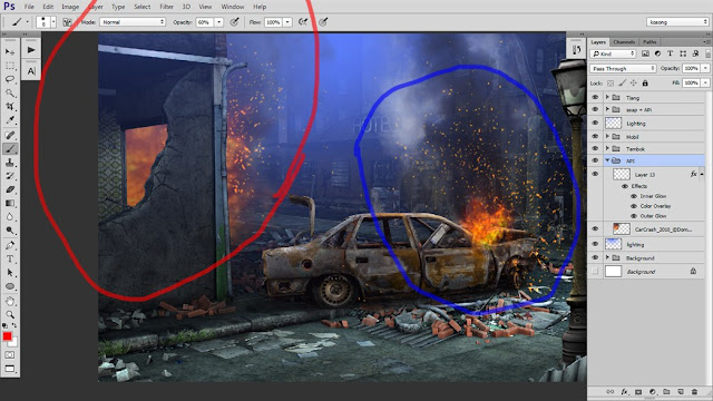 32. Buat layer baru pada folder mobil dan Background, gunakan softround brush dengan warna orange, ubah blending mode layer menjadi overlay. untuk membuat cahaya yang timbul dari api pada sekitar mobil dan background (jalan).