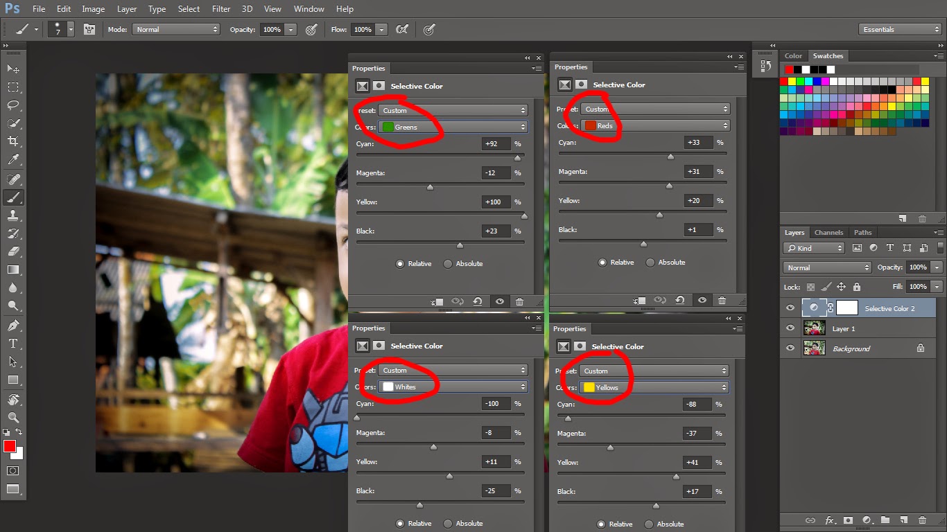 6. Klik pada layer Adjusment color layer lalu pilih Selective Color, atur nilain Atur nilai Red, Green, Yellow & White sesuai keinginan seperti terlihat pada gambar.